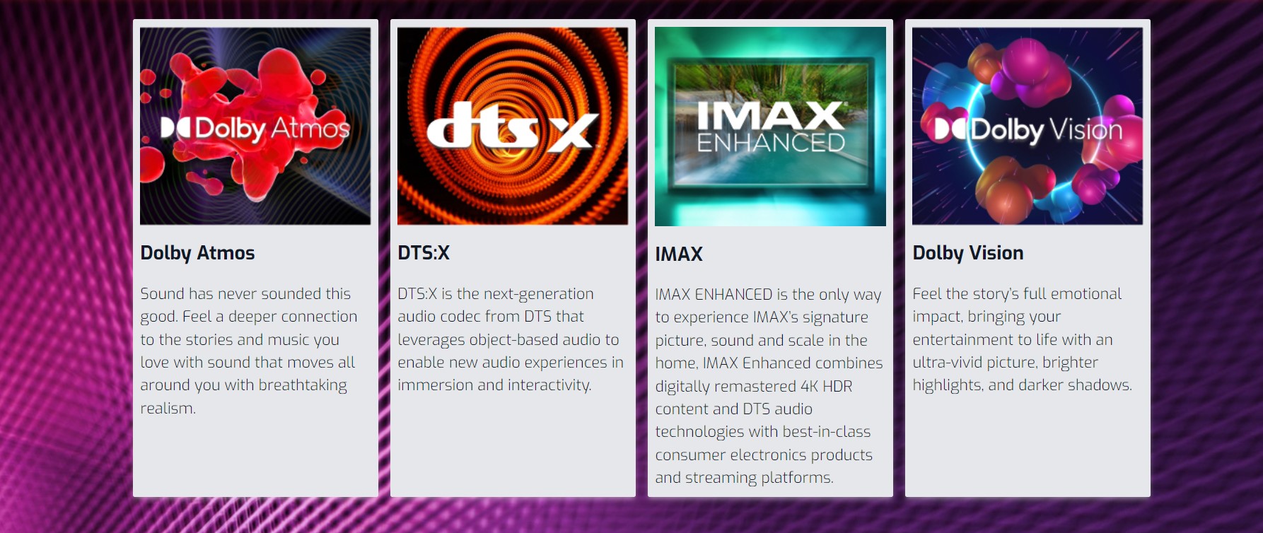 Dolby Atmos®, DTS:X®, DTS Virtual:X™, and IMAX® Enhanced processing are all supported to allow you to listen to all of your favourite audio formats up to 19-channels (15.4).