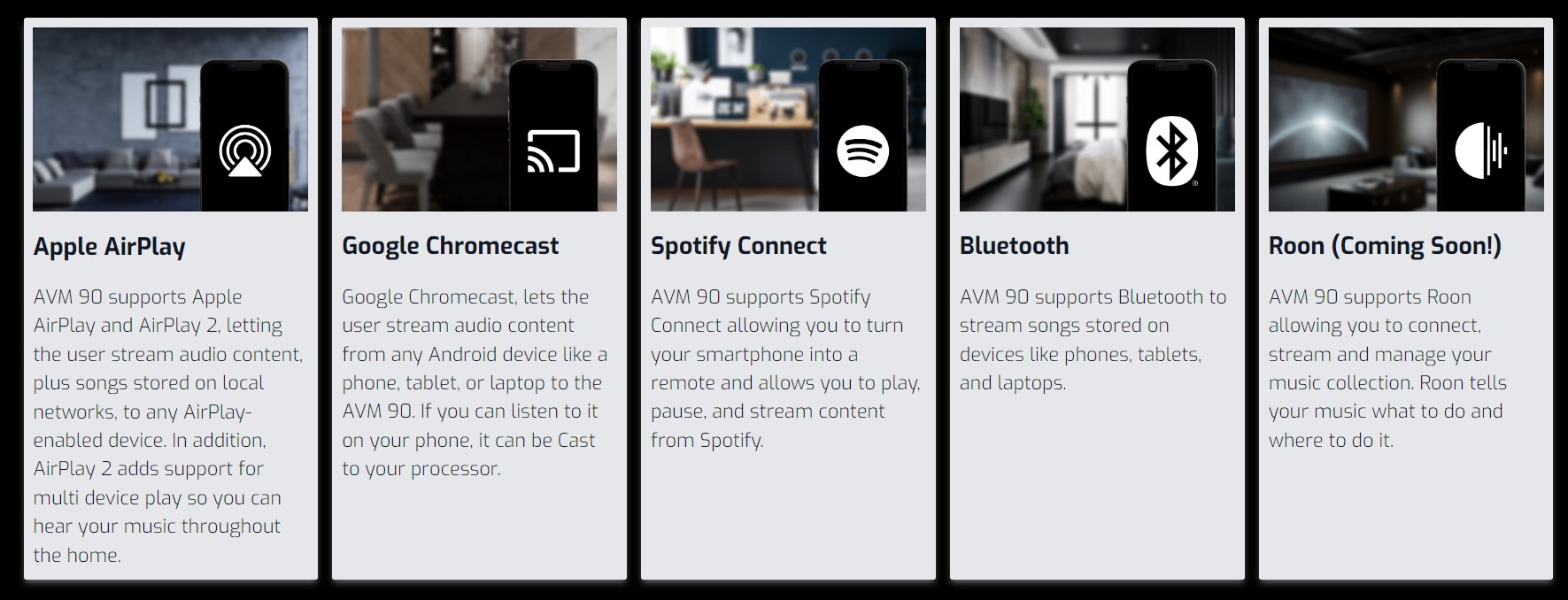 The AVM 90 includes a robust set of streaming options that can pull your music in from local storage or from the Internet. Thanks to Anthem’s high-speed processing and premium digital-to-analog conversion using high-end DACs, sound quality can be every bit as good as dropping a CD into a dedicated disc player.