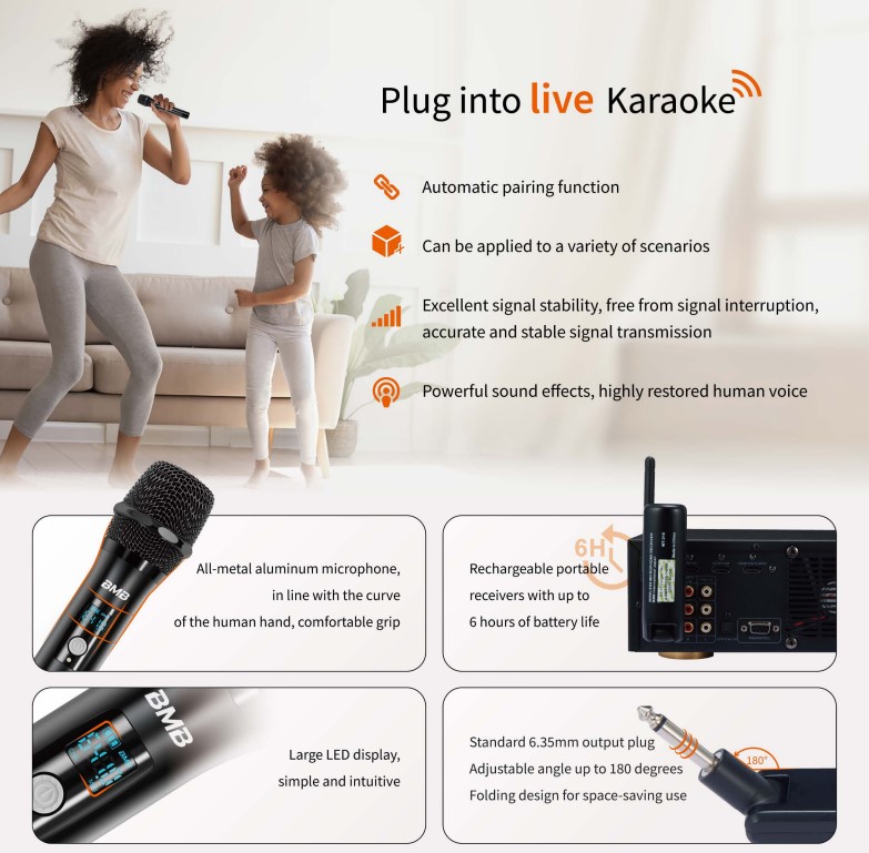 The WH-210 dual wireless microphone is the new value series but does not compromise the quality you would expect from BMB. The all-metal aluminum microphone handhelds make it ergonomically fit for a comfortable grip. Last but not least is the large LED display on the handhelds.
