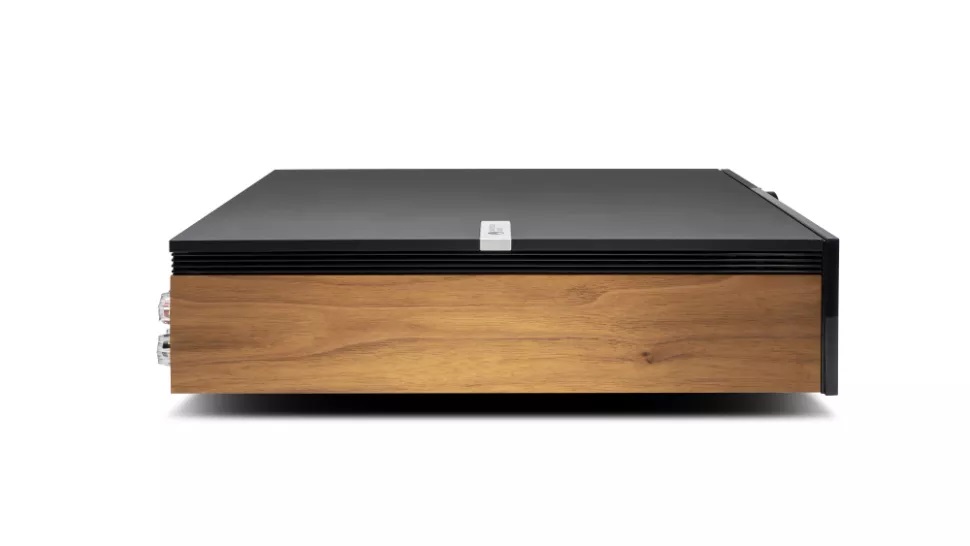 Of course, beauty lies in the eye of the beholder, so Cambridge has found a way to appeal to more than one taste and living room decor. The black anodised aluminium chassis – somewhere between half and full-width chassis, measuring 31.7cm wide and about as deep – features magnetically attached side panels that can be swapped out at the owner’s discretion. The included panels are walnut wooden (a nod to Cambridge's first product, the P40 amplifier released in 1968) and an attractively corrugated material made primarily from a recycled paper called Richlite.