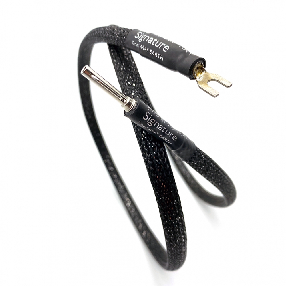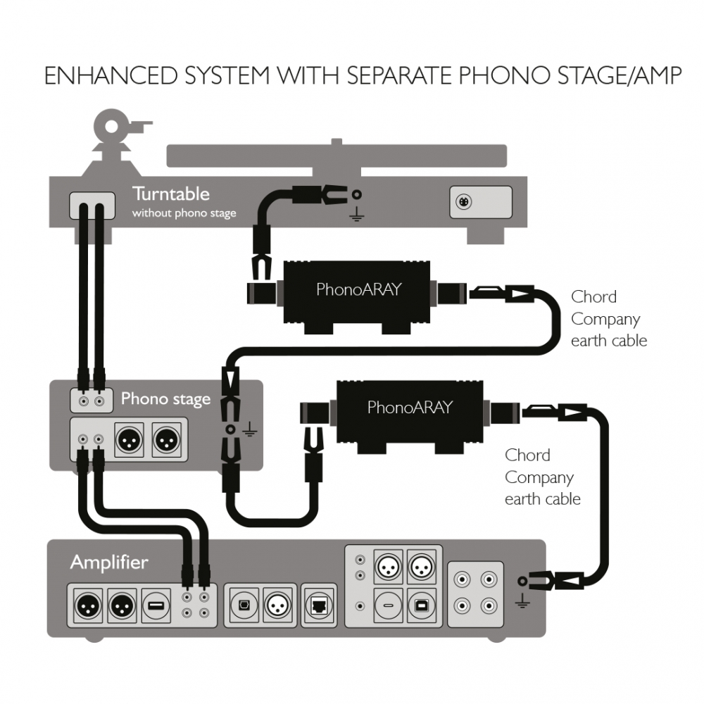 The PhonoARAY connects the earth terminal of the turntable (or tonearm) to the earth terminal of the phono stage (or amplifier phono input) and is supplied with a dedicated 50cm screened earth cable (4mm to spade connector) to be used between the PhonoARAY and the phono input earth.