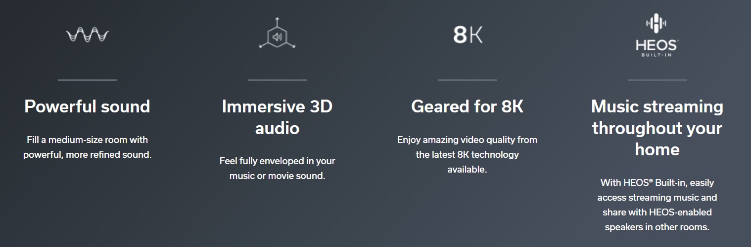 Enjoy incredible 8K video and immersive 3D audio from the AVRX2800H. Fill medium-size rooms with more refined sound from a 7.2 or 5.2.2 set up with Dolby Atmos and DTS:X. And with HEOS® Built-in, wirelessly stream online music and share with HEOS-enabled speakers in other rooms.
