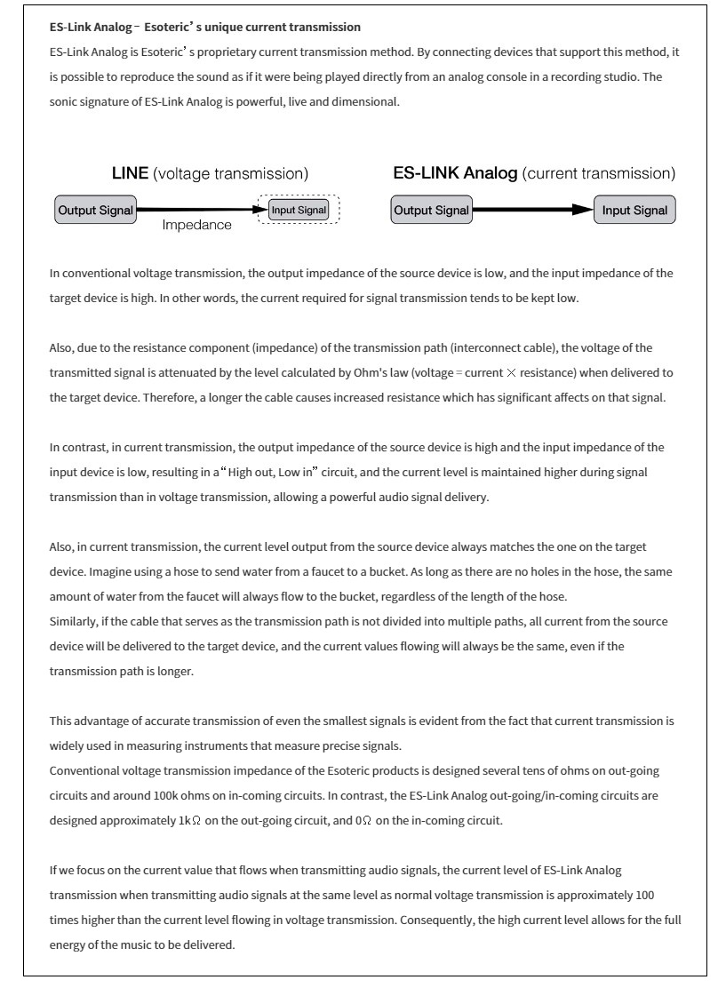 ES-Link Analog is a unique current transmission method that eliminates the influence of cable impedance and maintains sound fidelity and quality, the most important factors in signal transmission. 3 XLR inputs can be switched between ES-LINK Analog and standard XLR. The pre-outs are also equipped with two systems, ES-Link Analog and XLR, so that the ES-Link Analog connection can be used to complete the connection to the final stage of signal amplification.
