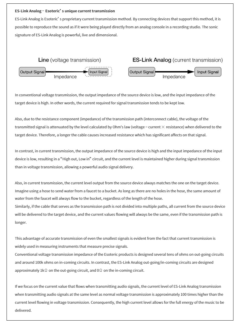 With the flagship Grandioso amplifier models, Esoteric is breaking new ground by pushing the limits of fidelity in pre-preamp-to-amplifier signal transmission. Esoteric’s unique current transmission system “ES-Link Analog” is the ideal method for preamp to amplifier transmission where the signal level is extremely low. Compared to the conventional voltage transmission, it transmits approximately 100 times more current, making it less susceptible to noise and sending the full energy of the music to the amplifier.