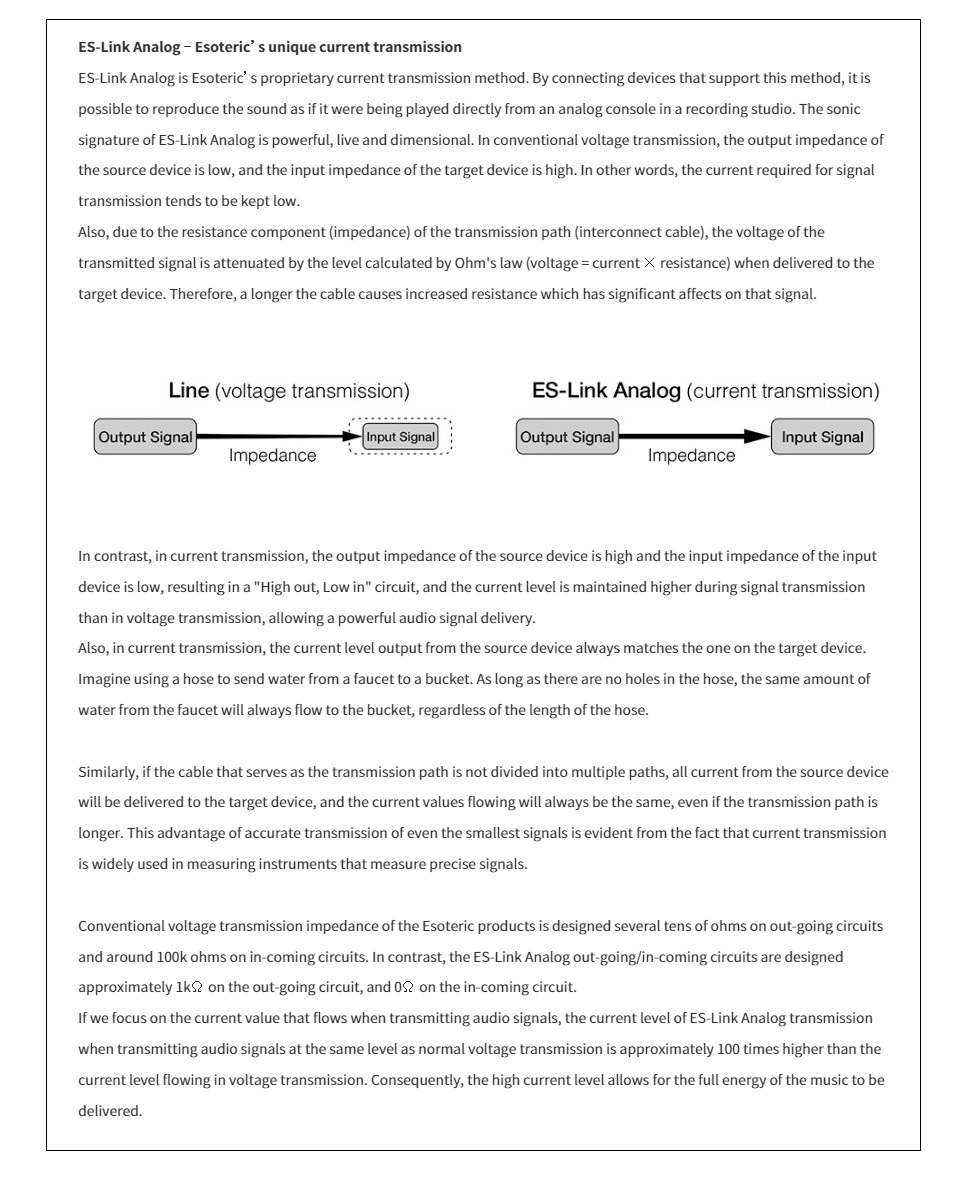 With the flagship Grandioso amplifier models, Esoteric is breaking new horizons by pushing the limits of fidelity in preamp-to-amplifier signal transmission. Esoteric’s unique current transmission system “ES-Link Analog” is the ideal method for preamp to amplifier transmission where the signal level is extremely low. Compared to the conventional voltage transmission, it transmits approximately 100 times more current, making it less susceptible to noise and sending the full energy of the music to the amplifier.