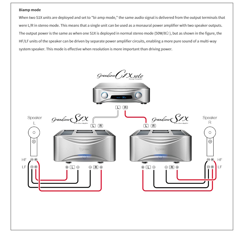 The Grandioso S1X behaves not only as a stand-alone stereo power amplifier, but also offers flexibly in a variety of high-end-worthy applications. The system is expandable to a mono-block amplifier by deploying two S1Xs, depending on the matched speakers and the operating environment. A mode selector supports conventional stereo mode and bi-amp mode for multi-way speakers with separate HF/LF inputs. You can freely customize the configuration of the Class-A amplifier system of your dreams according to the quality and characteristics of the sound you desire. Even if you use multiple amplifiers, the power on/off is controllable from the Grandioso C1X preamplifier via DC trigger*, allowing sophisticated use suitable for high-end applications.