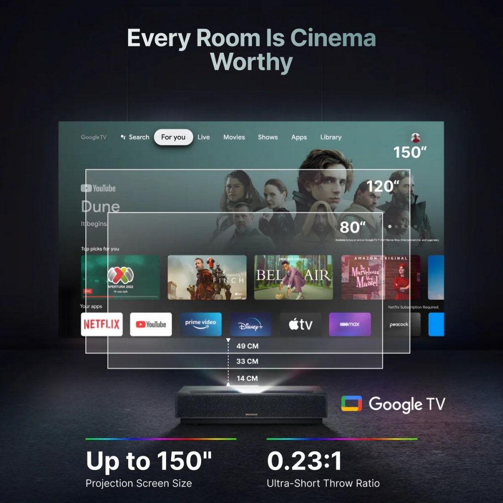 You’ll need only 49cm between a 150” screen and the Formovie Cinema Edge, boasting an ultra-short throw ratio of only 0.23:1 to make even the smallest room an entertainment area.