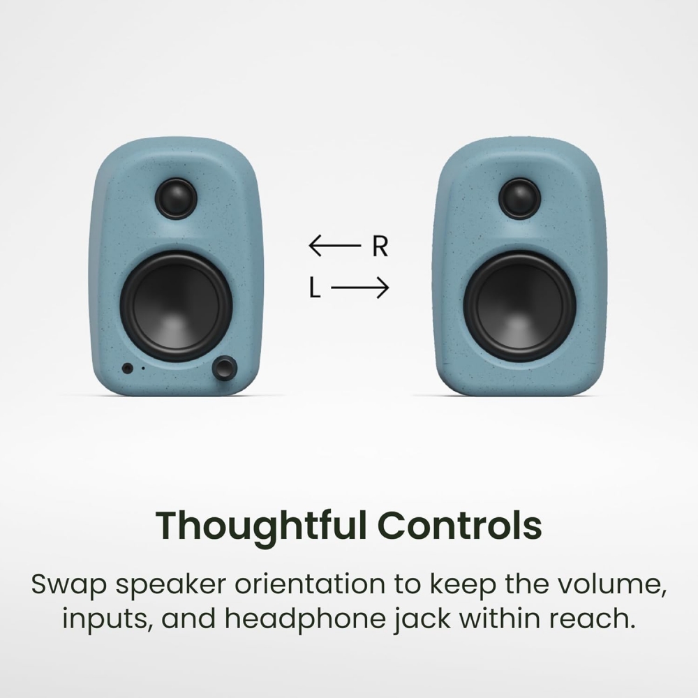 Uki keeps control intuitive and within reach. A quick switch flips speaker orientation so volume and headphone access are always close at hand, while the front-mounted dial lets you adjust volume, change inputs, and power on or off — all in one smooth motion.
