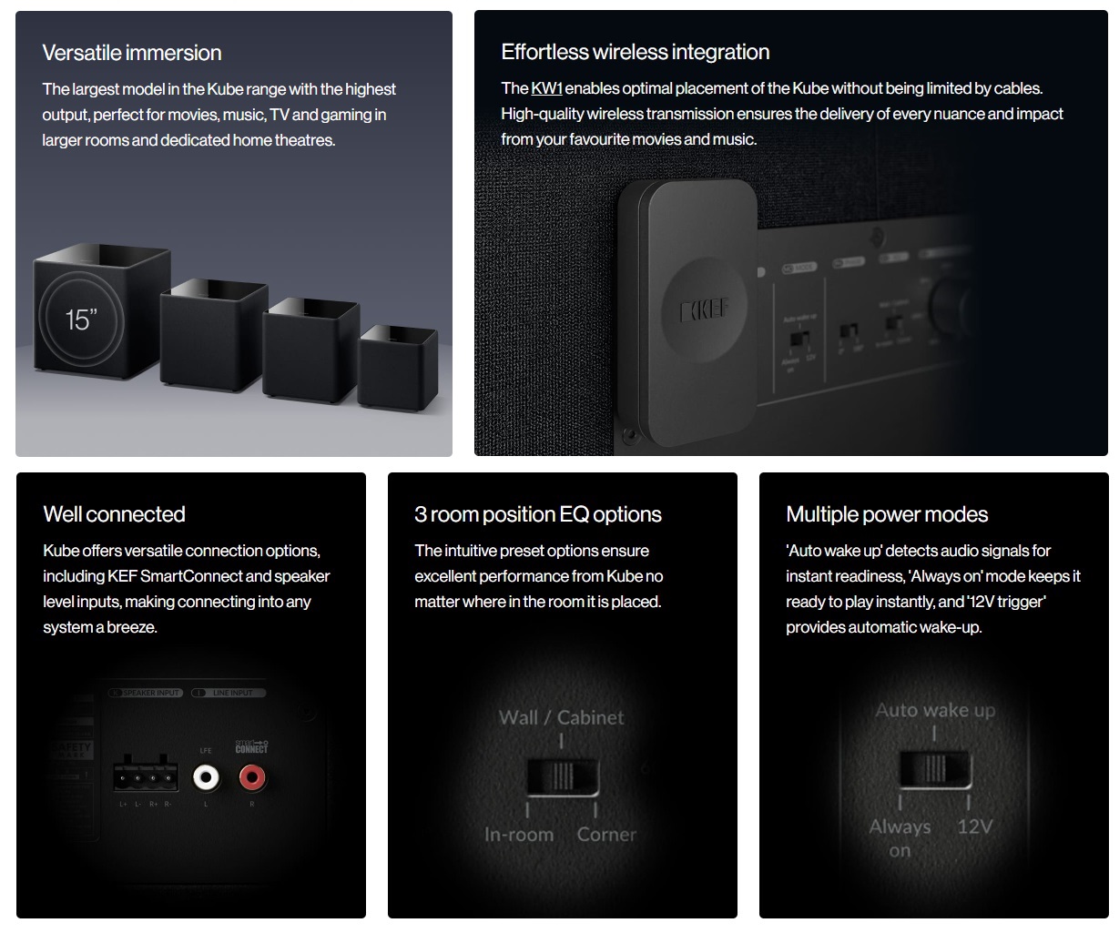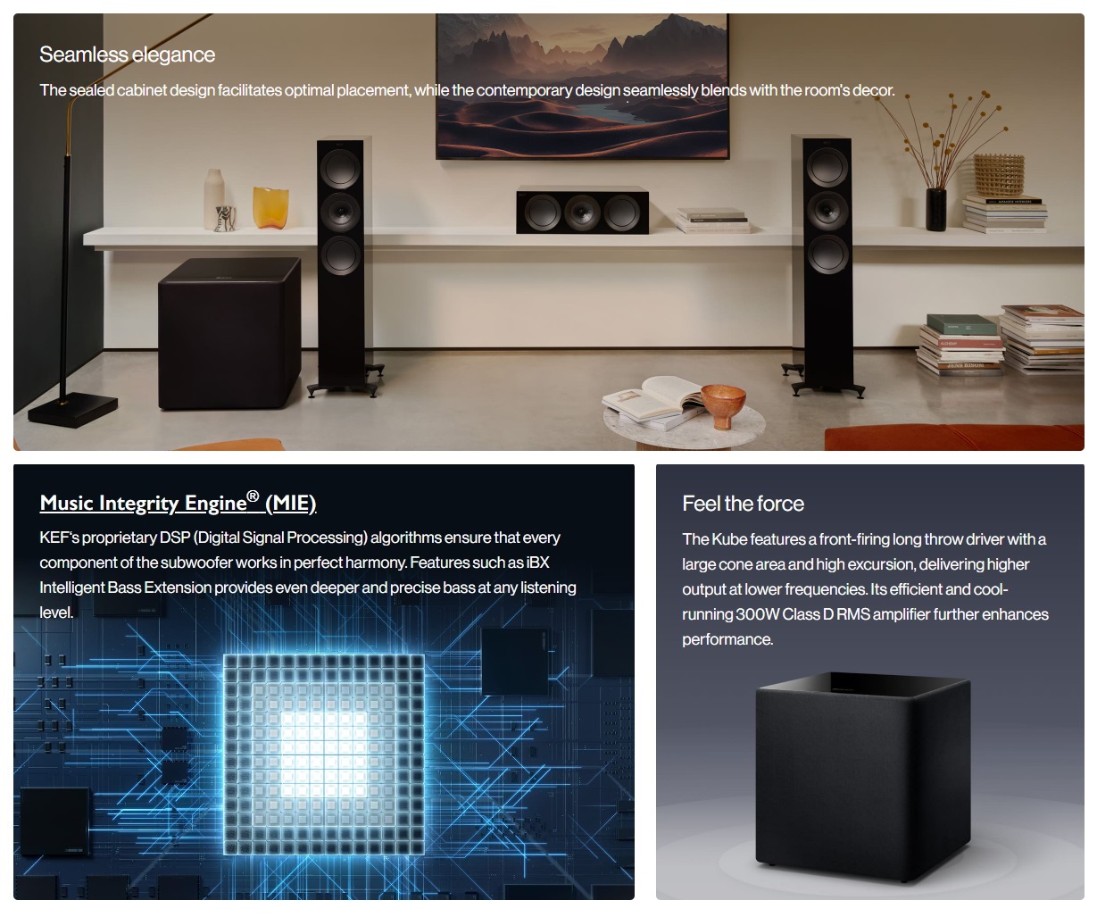 Kube 15 MIE, the largest model in the Kube range, is engineered to provide the deepest bass for music and movies, giving you a ground-shaking immersion. Perfectly suited for large rooms, the 15-inch driver and 300W (RMS) Class D amplifier combine to deliver the most visceral bass performance. With Music Integrity Engine®, the Kube 15 MIE is optimised to deliver exceptional depth and dynamics.