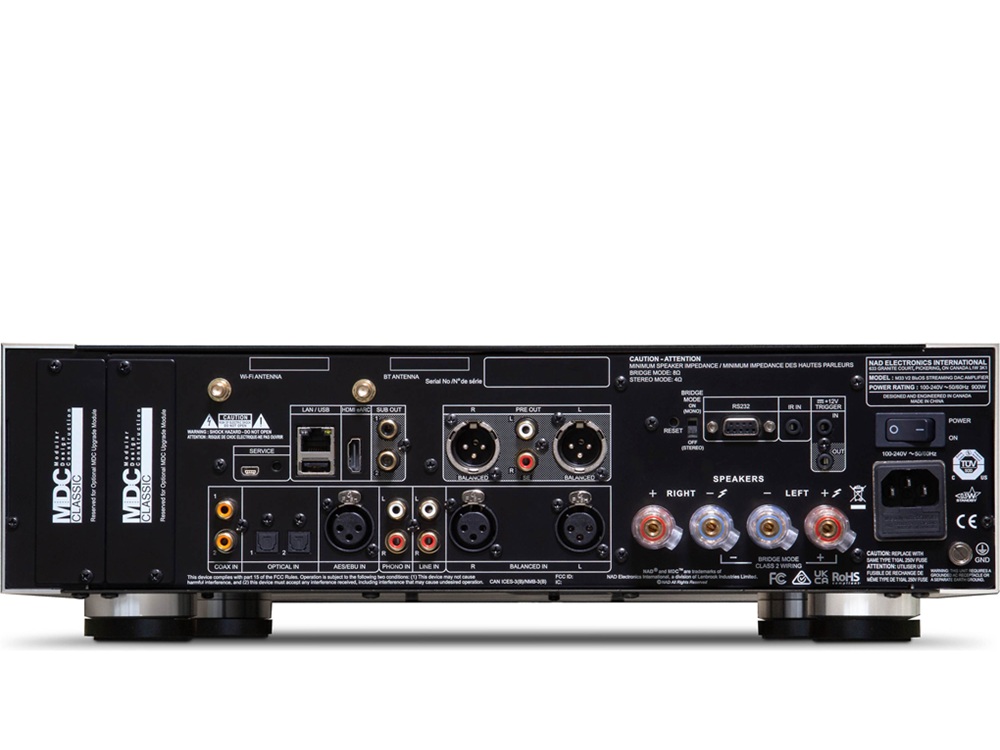 In its standard configuration, the NAD M33 V2 BluOS streaming amp is a complete system—just add speakers. HDMI eARC, digital and analog inputs, a premium MM/MC phono stage, and balanced XLR stereo amplifier inputs and preamp outputs provide everything you need for today and tomorrow. For future expansion, two MDC slots allow for the addition of new modules like the MDC USB DSD, enabling DSD playback and USB audio support. Dual independent subwoofer outputs now offer higher output than the original M33, allowing users to expand easily into multi-subwoofer, Dirac-optimized systems—ideal for home theatre enthusiasts or those seeking reference-grade 2-channel power amp performance with integrated streaming.