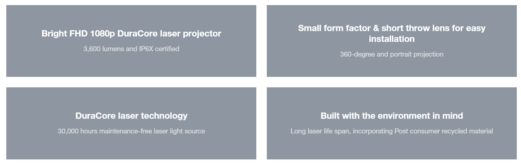 With the latest laser technology and higher power conversion efficiency, the product saves up to 47% of power consumption compared with a lamp-based projector at similar capacity