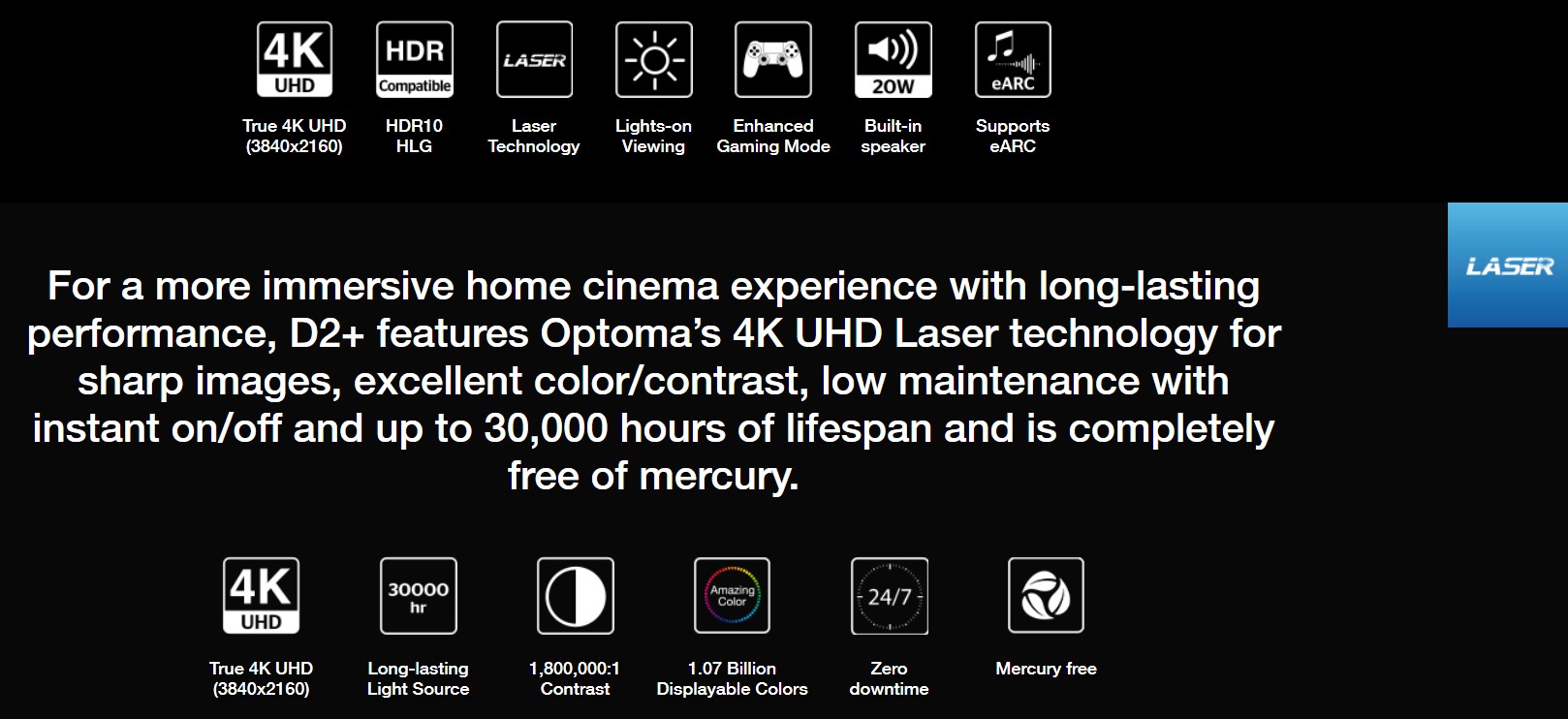 SKU: Optoma CinemaX D2+Laser Light Source with life span up to 30,000 hours (ECO Mode).