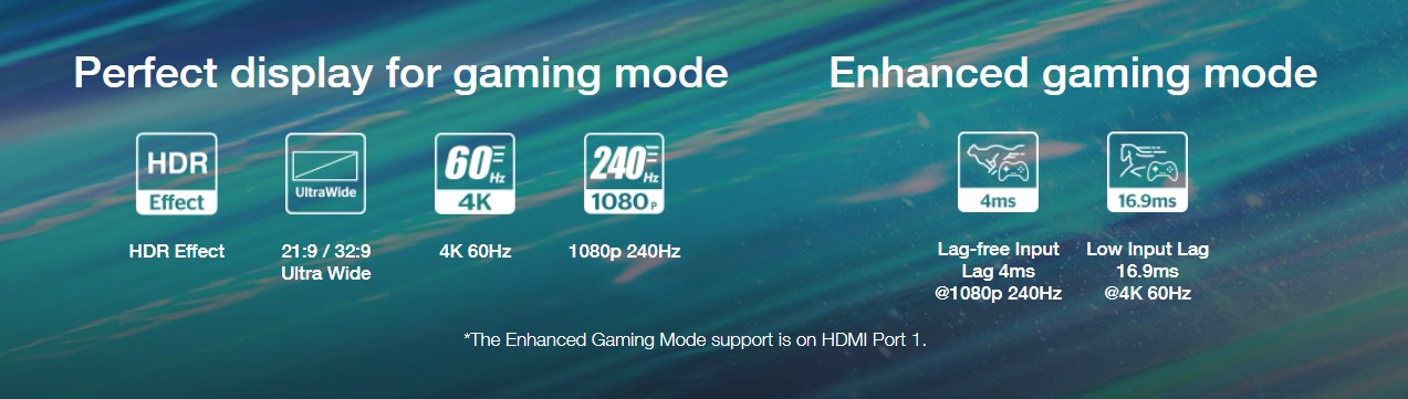 Superb gaming experience with extremely low 4ms Input Lag for 240Hz at 1080P, 16.9ms for 60Hz at 4K UHD