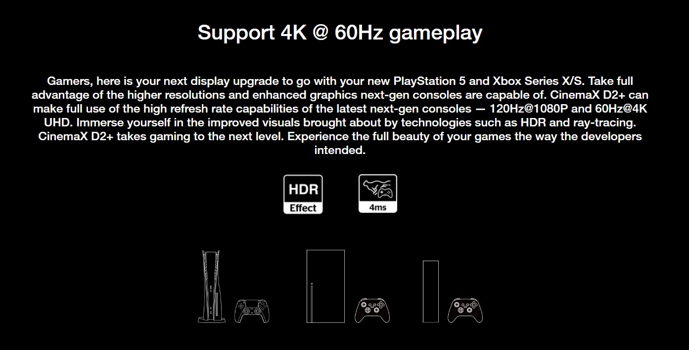 Optoma takes gaming to the next level. CinemaX D2+ packs in everything a gamer could want: An immersive large screen image with a rich color gamut, extremely-low input lag, high refresh rates, good motion handling and excellent contrast—perfect for intense gaming as well as casual gaming.