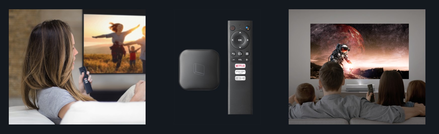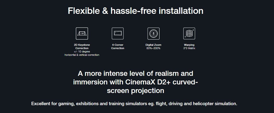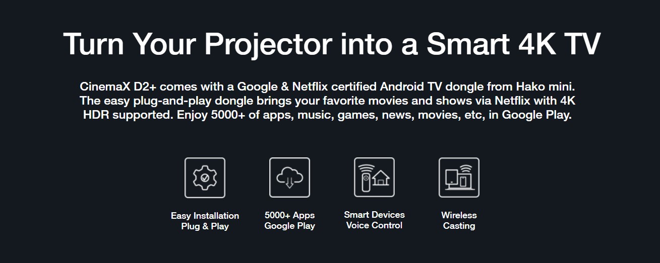 CinemaX D2+ brings the ultimate home entertainment experience, with Enhanced Gaming mode which supports up to 240Hz refresh rate at 1080P and 60Hz at 4K UHD, and extremely low input lag down to 4ms. D2+ also come with a Google & Netflix certified Android TV dongle from Hako mini, easily turning your projector into a Smart 4K TV in just a minute. The ability to implement 4-corner adjustment, 2D keystone correction, digital zoom, and warping at 3*3 matrix, allows CinemaX D2+ to be installed any way you want.