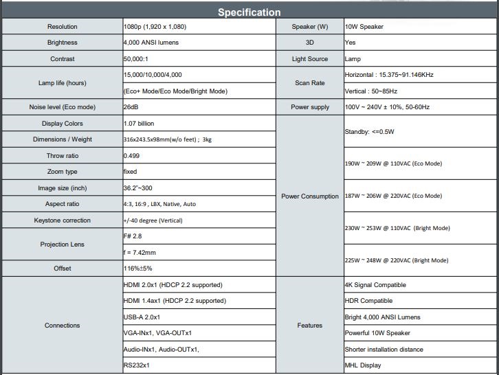 Transform the delivery of your movie and gaming time with the first ever 4,000 lumens, 1080p, short throw design GT1080HDR projector. This model is designed to be used at any time of day and for every home entertainment scenario. It offers top quality projected colors, long lamp life with a low overall cost of ownership.