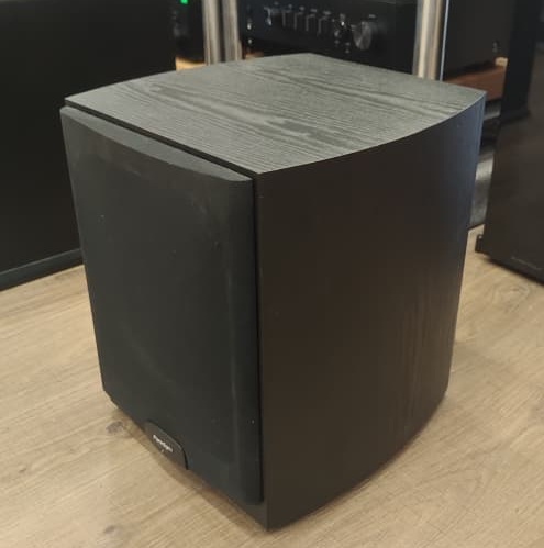 8-inch single driver, bass-reflex, high-velocity low-turbulence resistive port. Built-in amplifier boasts improved soft-clipping circuitry for lower amplifier distortion and even cleaner maximum output levels.