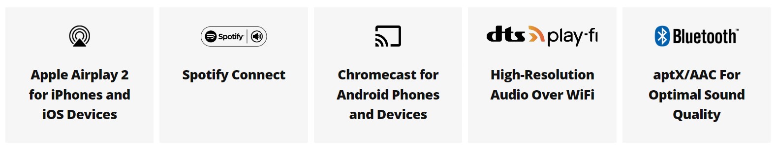 - Native control via Apple Airplay 2 for iPhone and iOS, Spotify Connect, & Google Chromecast for Android Phones and Devices