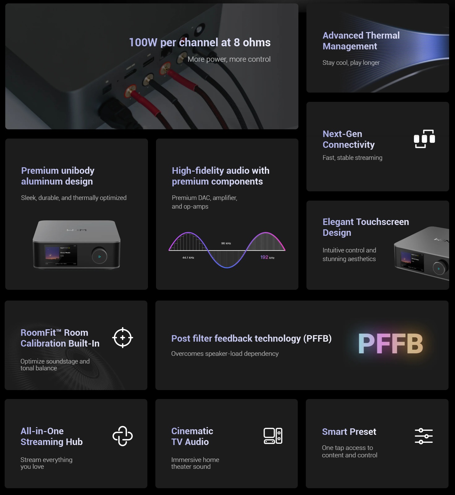 100W of pure hi-fi power with a vibrant 3.5″ touchscreen for smart, seamless control