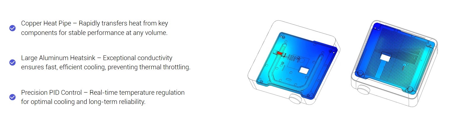 Thermal Management: Copper heat pipe, large aluminum heatsink, unibody aluminum case, and precision PID thermal control Cooling System: Passive, silent operation
