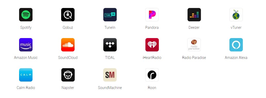 Streaming Services in AppSpotify, Amazon Music, Deezer, Tunein, Tidal, Qobuz, SoundCloud, Pandora, iHeartRadio, vTuner, Napster, Sound machine, etc.